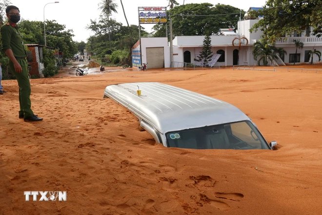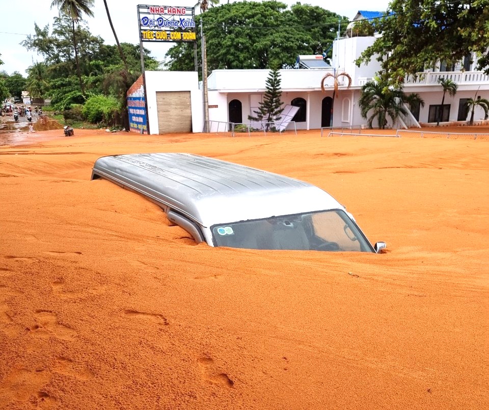 Lũ cát đỏ từ đồi cao tràn xuống đường Huỳnh Thúc Kháng (phường Mũi Né) với lực chảy mạnh làm lún một số xe ôtô, nhiều xe máy bị cát vùi lấp không thể di chuyển được.