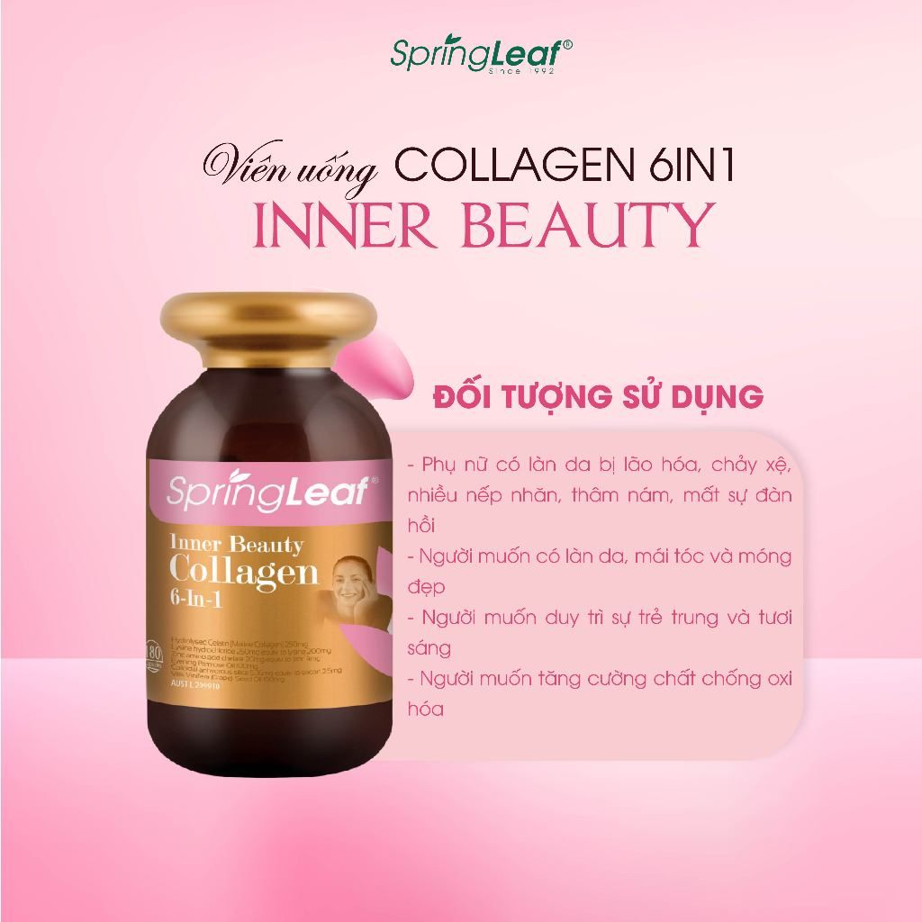 Viên uống Collagen 6 trong 1 chống lão hóa Spring Leaf Inner Beauty Collagen 6-in-1 với công thức mới tăng cường độ trẻ hóa cho làn da của bạn.