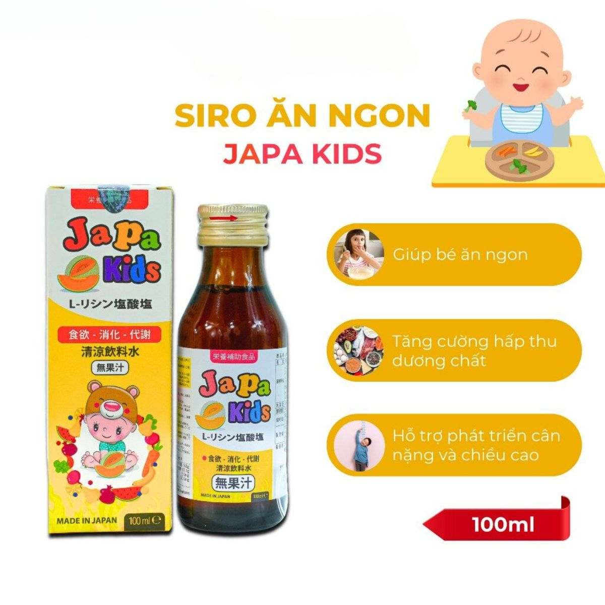 Japa Kids là một sản phẩm được nhập khẩu độc quyền nguyên hộp từ Nhật Bản với dạng siro hoa quả, vị ngọt thanh. Trong Japa Kids chứa các thành phần chính gồm sữa ong chúa, L-Lysine và vitamin nhóm B1, B2, B3, B6 tác động trực tiếp tới vị giác, kích thích cảm giác thèm ăn, đẩy lùi biếng ăn.