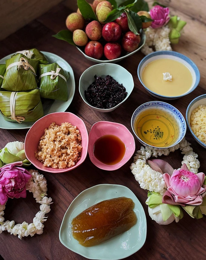 "Đây đều là những món ngon thơm thảo từ gạo nếp, đỗ xanh, hoa trái mùa hè để tạ ơn trời, đất và các vị thần linh, tổ tiên", chị Hương nói.
