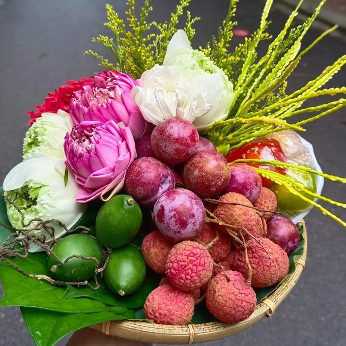 Chị Lê Thị Hoa (32 tuổi, ở Hà Nội) chia sẻ, trước Tết Đoan Ngọ 6 ngày, chị đã liên hệ đặt mâm cúng ở một nhà hàng với giá 1,2 triệu đồng. Mâm lễ bao gồm trầu, cau, mận hậu, vải, cơm rượu nếp cẩm, sen quan âm gấp cánh… Tất cả được bày trong mẹt tre cao cấp.
