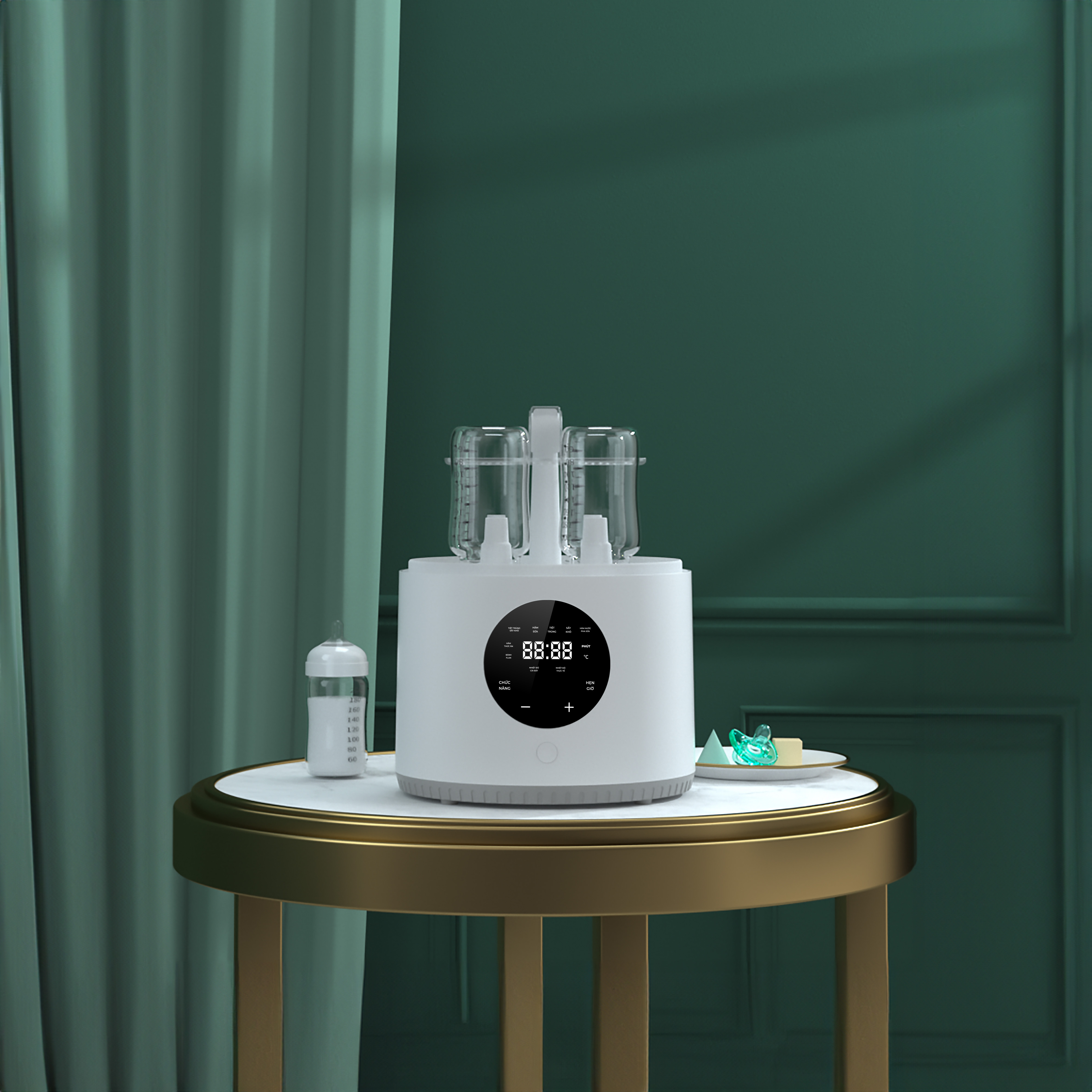 Máy còn có tính năng tiệt trùng đồ dùng của bé bằng hơi nước 3 chiều, giúp mẹ dễ dàng làm sạch các vật dụng như bình sữa, núm ti, đồ chơi và đồ ngậm của bé, đảm bảo an toàn cho bé khi ăn uống.