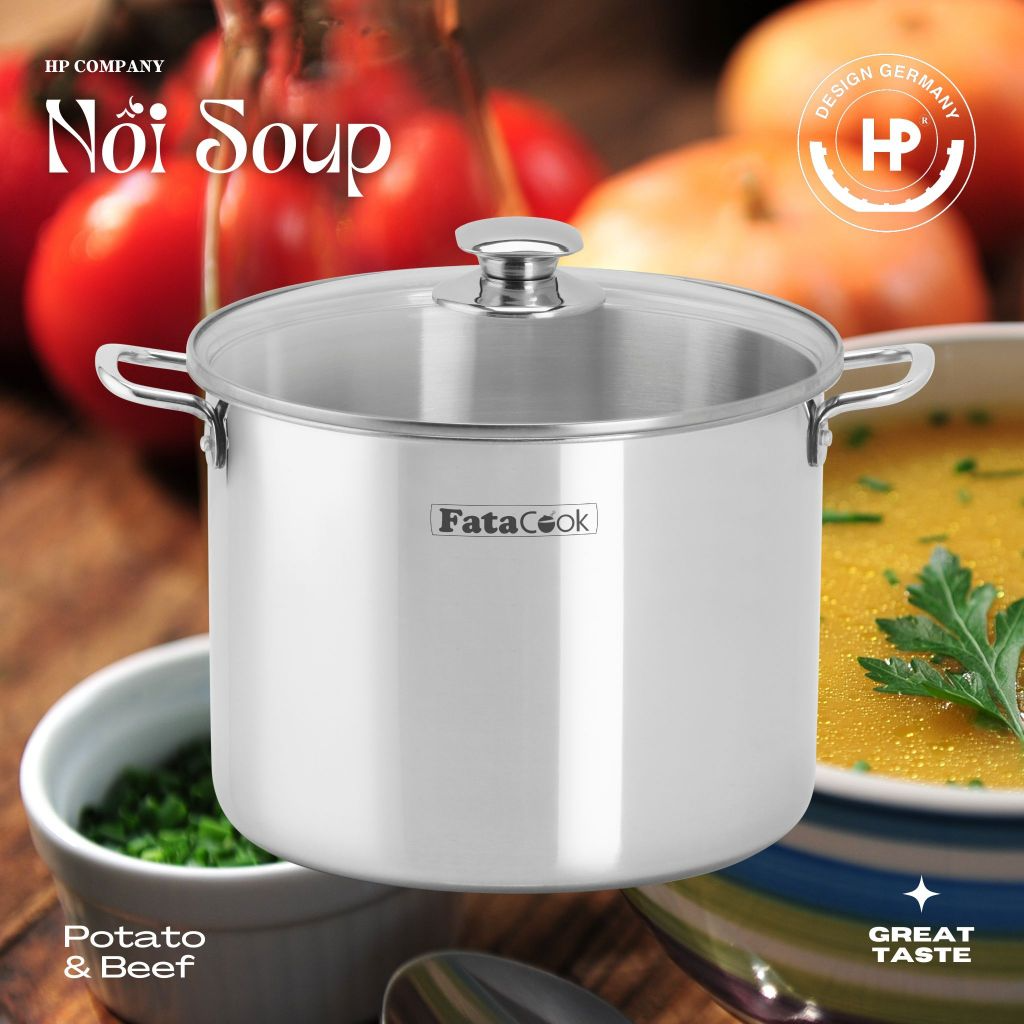 Nồi súp - Nồi luộc gà inox bếp từ Fatacook nắp kính đủ 3 size: 28 cm, 32 cm, 34 cm dùng được trên mọi loại bếp