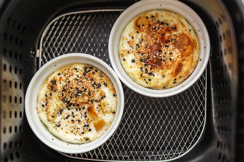 - Cắm điện và làm nóng nồi chiên không dầu trước 5 phút. Tiếp đến kéo khay chiên ra rồi đặt chén trứng vào rổ chiên. Cài đặt nhiệt độ nướng 140 độ, thời gian 6 phút.