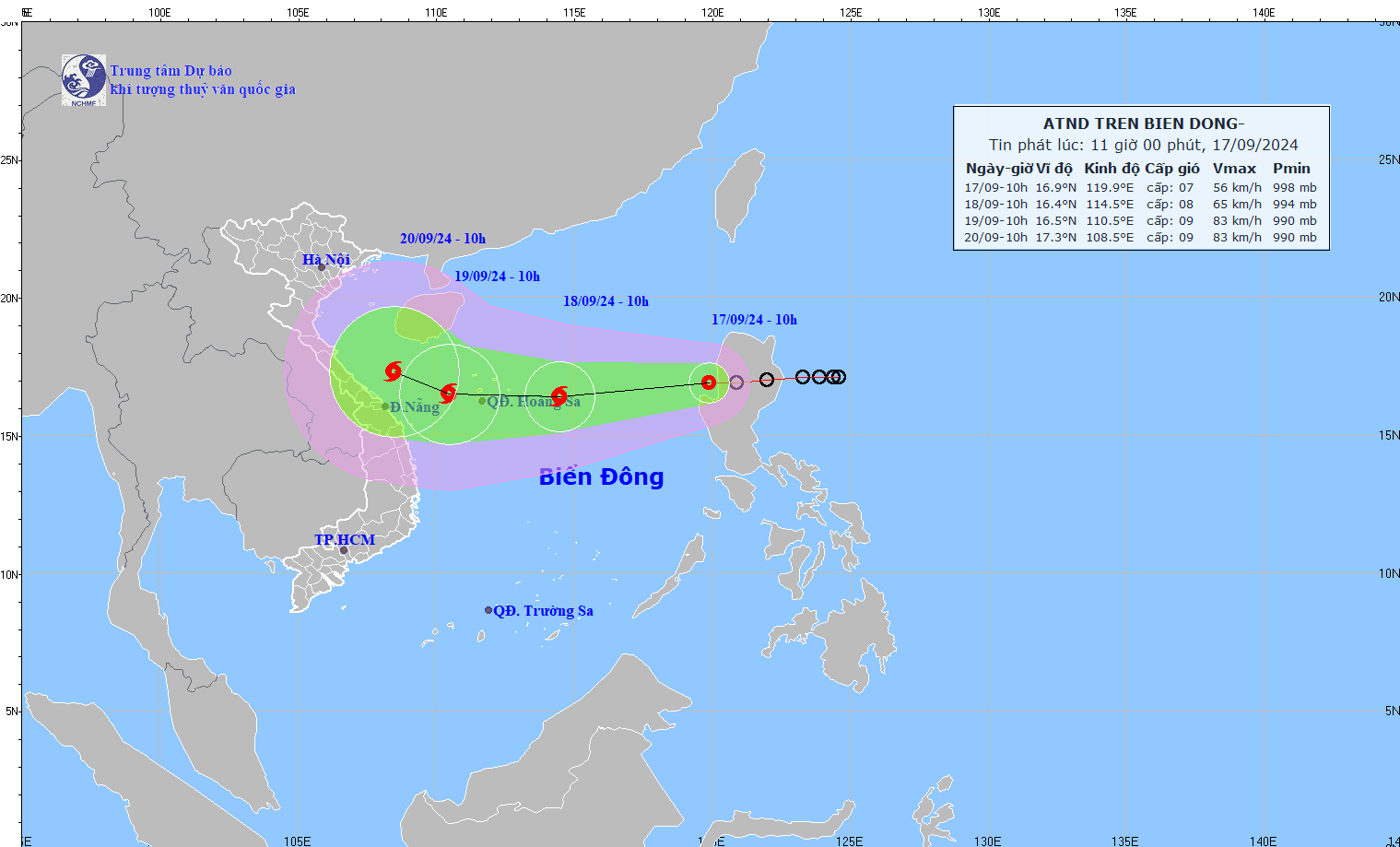 Đến 10 giờ ngày 18.9, vị trí tâm bão ở vào khoảng 16,5 độ vĩ bắc; 110,5 độ kinh đông; trên khu vực phía tây quần đảo Hoàng Sa. Bão mạnh cấp 9, giật cấp 11, mỗi giờ đi được 15 - 20 km.