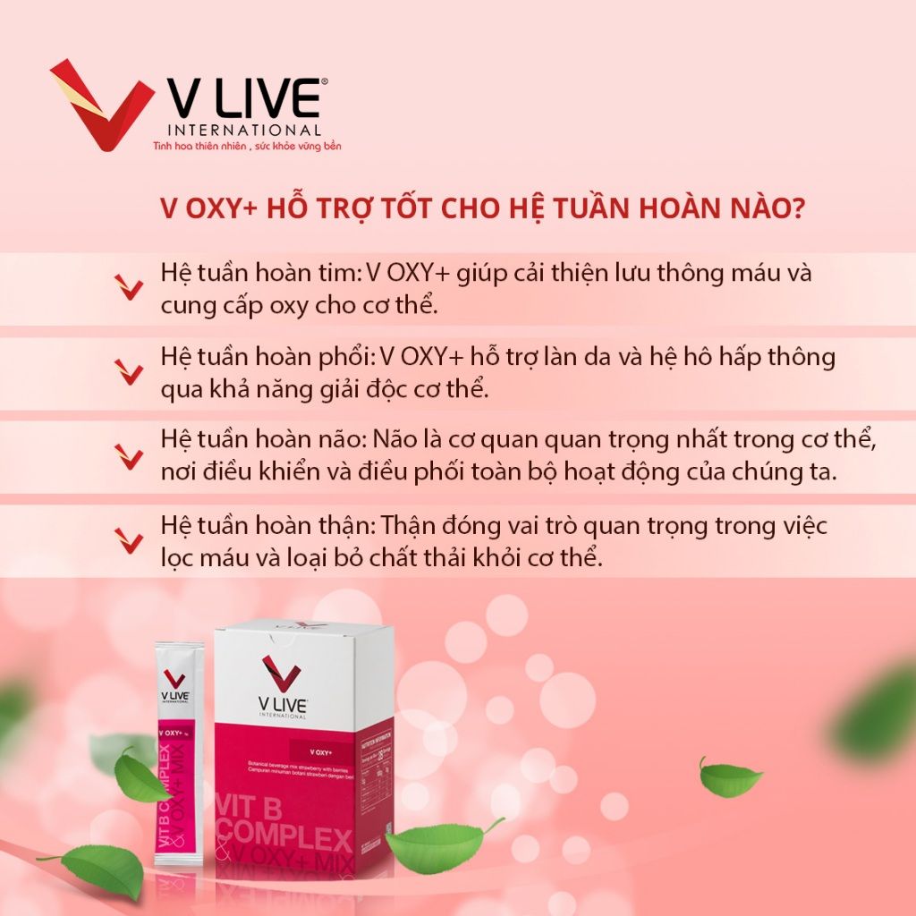 V Oxy+ nâng cao tính năng của chất dinh dưỡng khác, nếu được sử dụng kết hợp với các sản phẩm khác của V Live có thể đạt được hiệu quả gấp đôi. Trong nhiều sản phẩm, V Oxy+ ví như một đầu tàu, mở lối cho sản phẩm khác để giúp chúng ta xây dựng một hệ thống tế bào khoẻ mạnh.